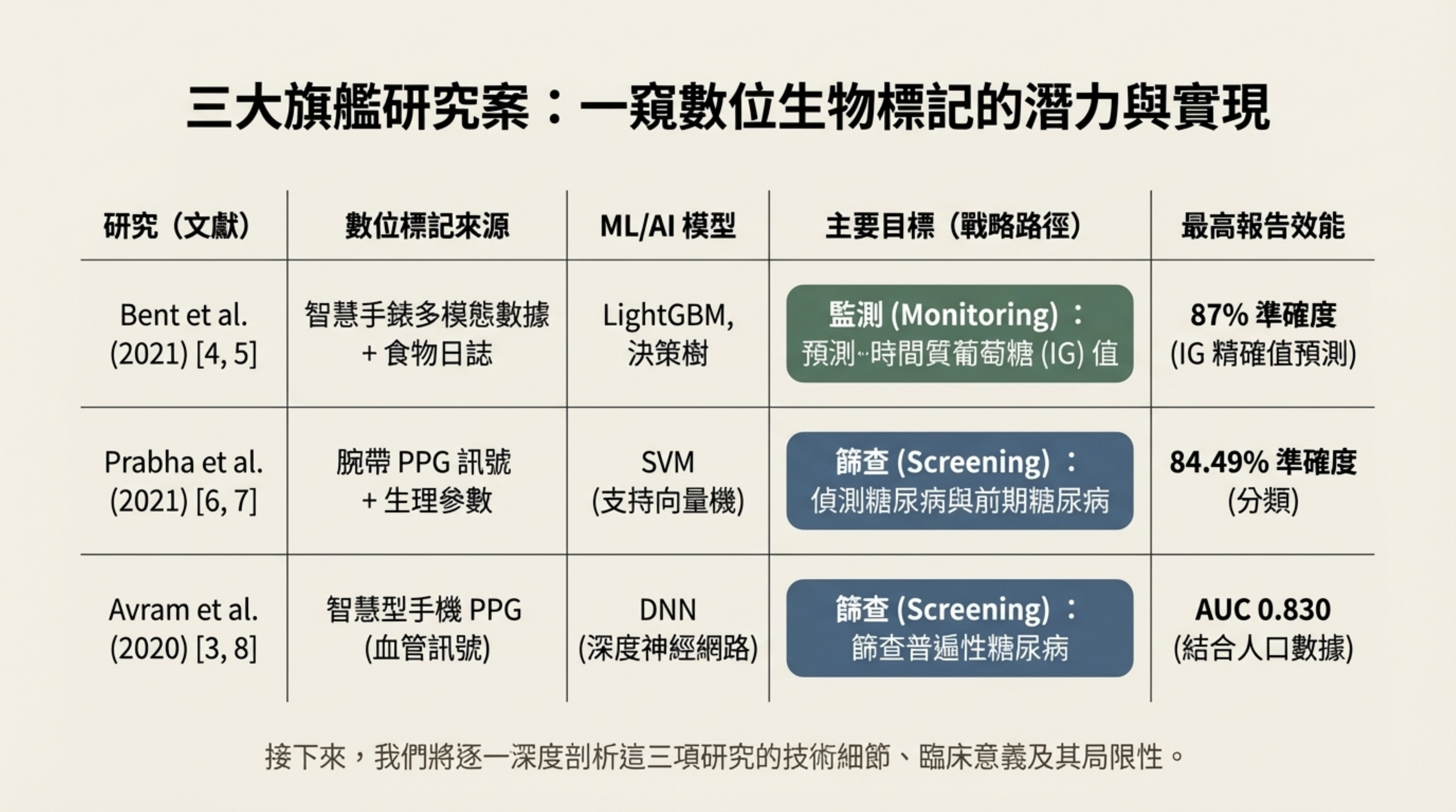 下層(高風險確認與監測):將篩查出的高風險者導入 Bent et al. 的多模態穿戴系統。進行高精度的持續追蹤與管理(目標 MARD <12%)。