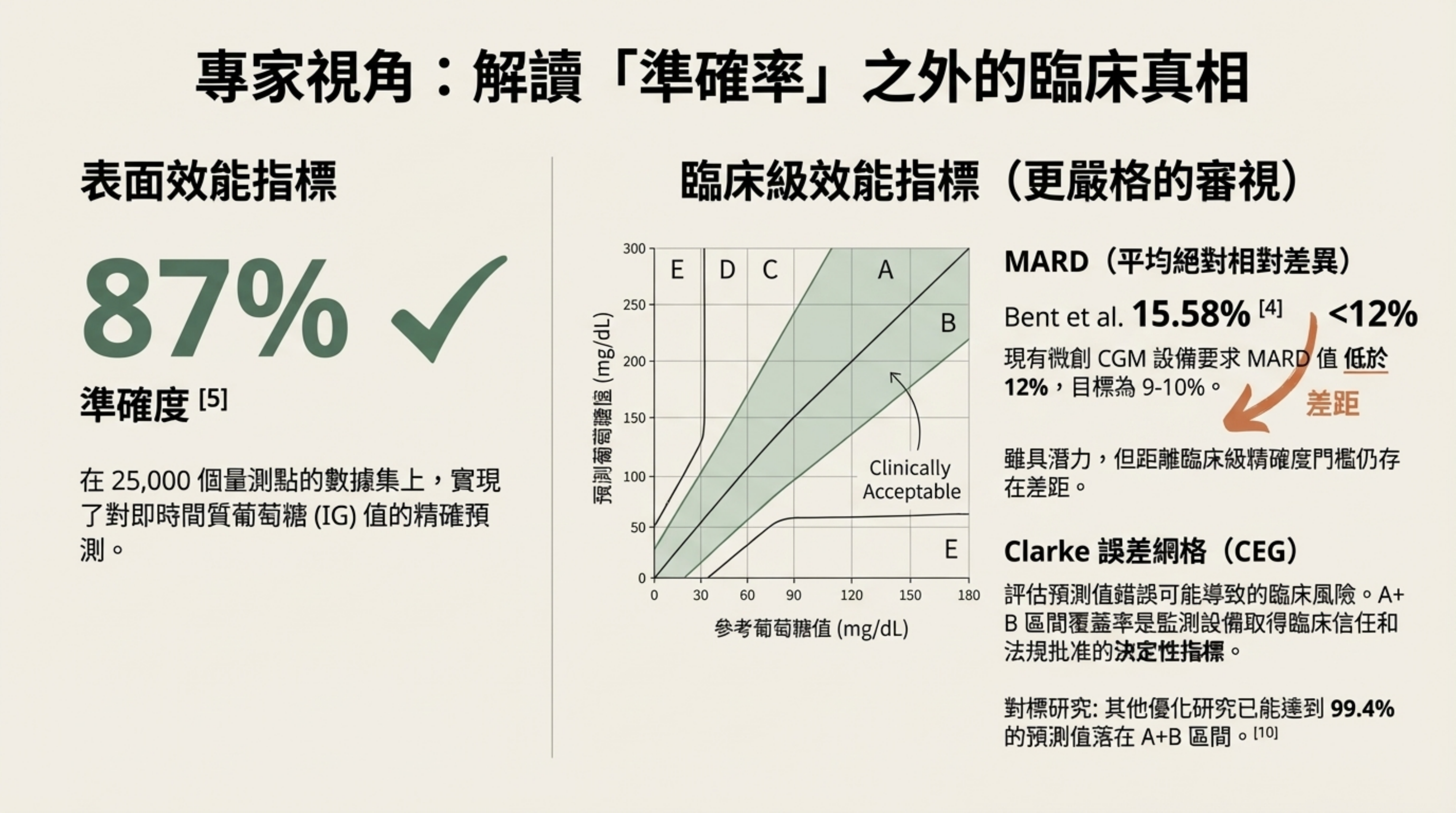 視覺核心:87% 準確度與 Clarke 誤差網格(CEG)/ MARD 的對比。 詳細說明:
