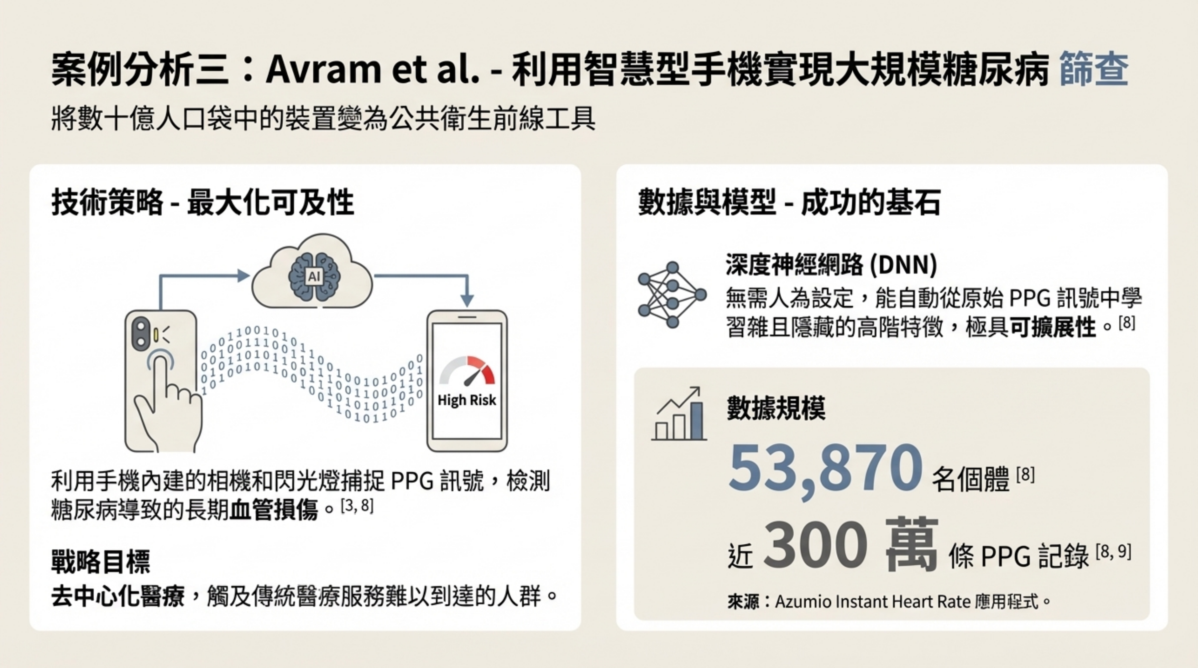 - 詳細說明: 這是一個整合性的解決方案建議: 上層(大規模初步篩查):使用 Avram et al. 的手機 PPG 模型。成本低、覆蓋廣,用來快速識別高風險者(AUC 0.830)。