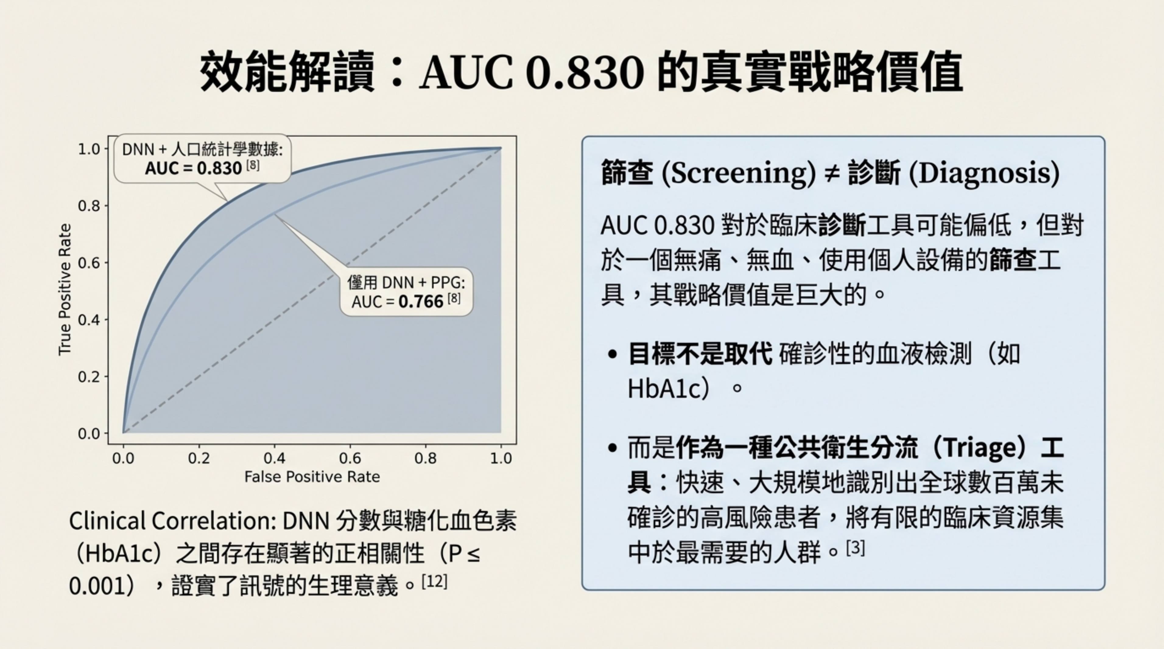 戰略定位:AUC 0.830 對「診斷」工具來說可能不夠,但作為「篩查(分流)」工具價值巨大。它不是要取代驗血,而是要從茫茫人海中快速抓出高風險族群,將昂貴的醫療資源集中在這些人身上 。