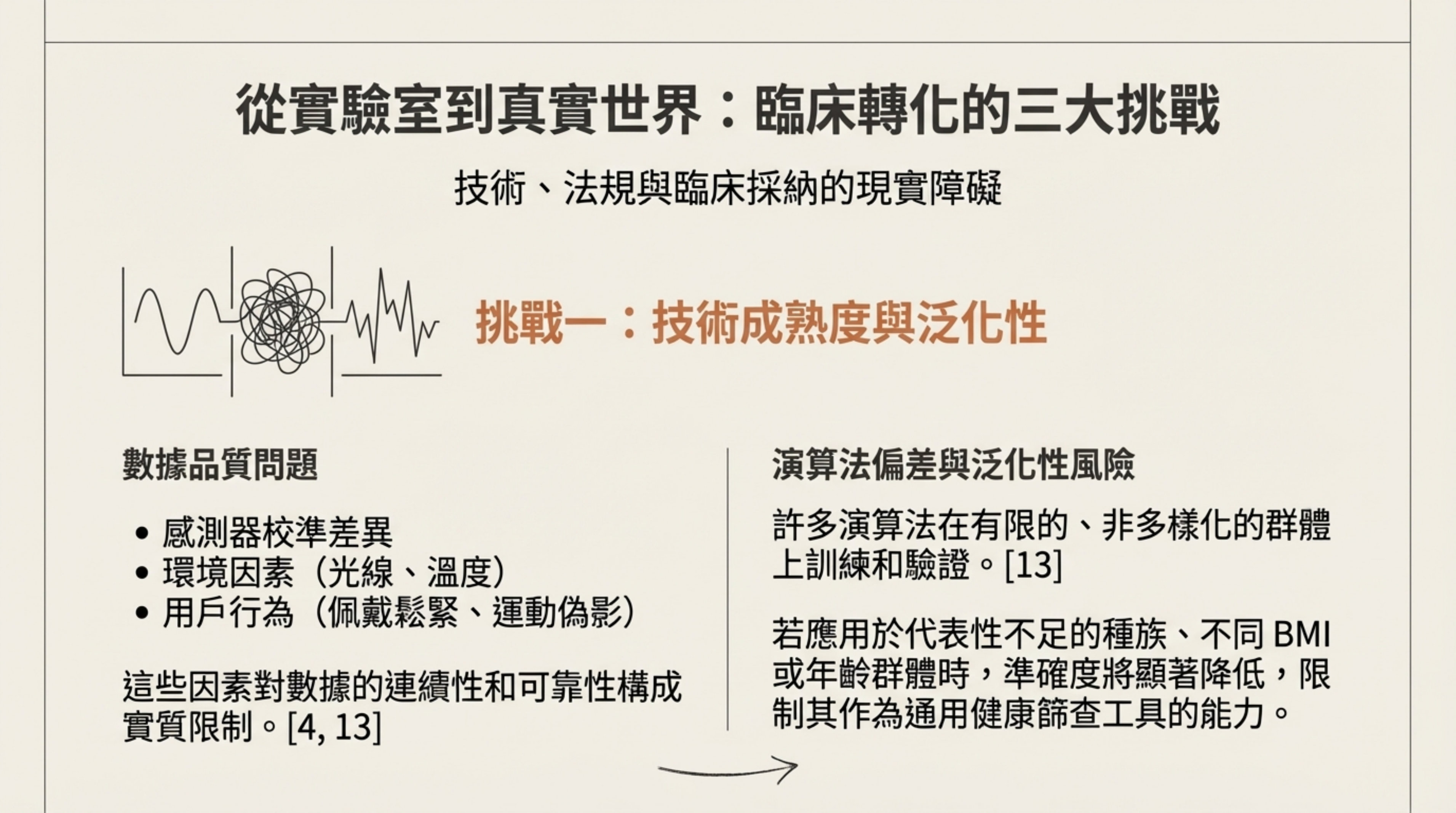 數據品質:真實世界充滿變數(光線、溫度、佩戴鬆緊、運動偽影),這會嚴重影響 PPG 的可靠性 。