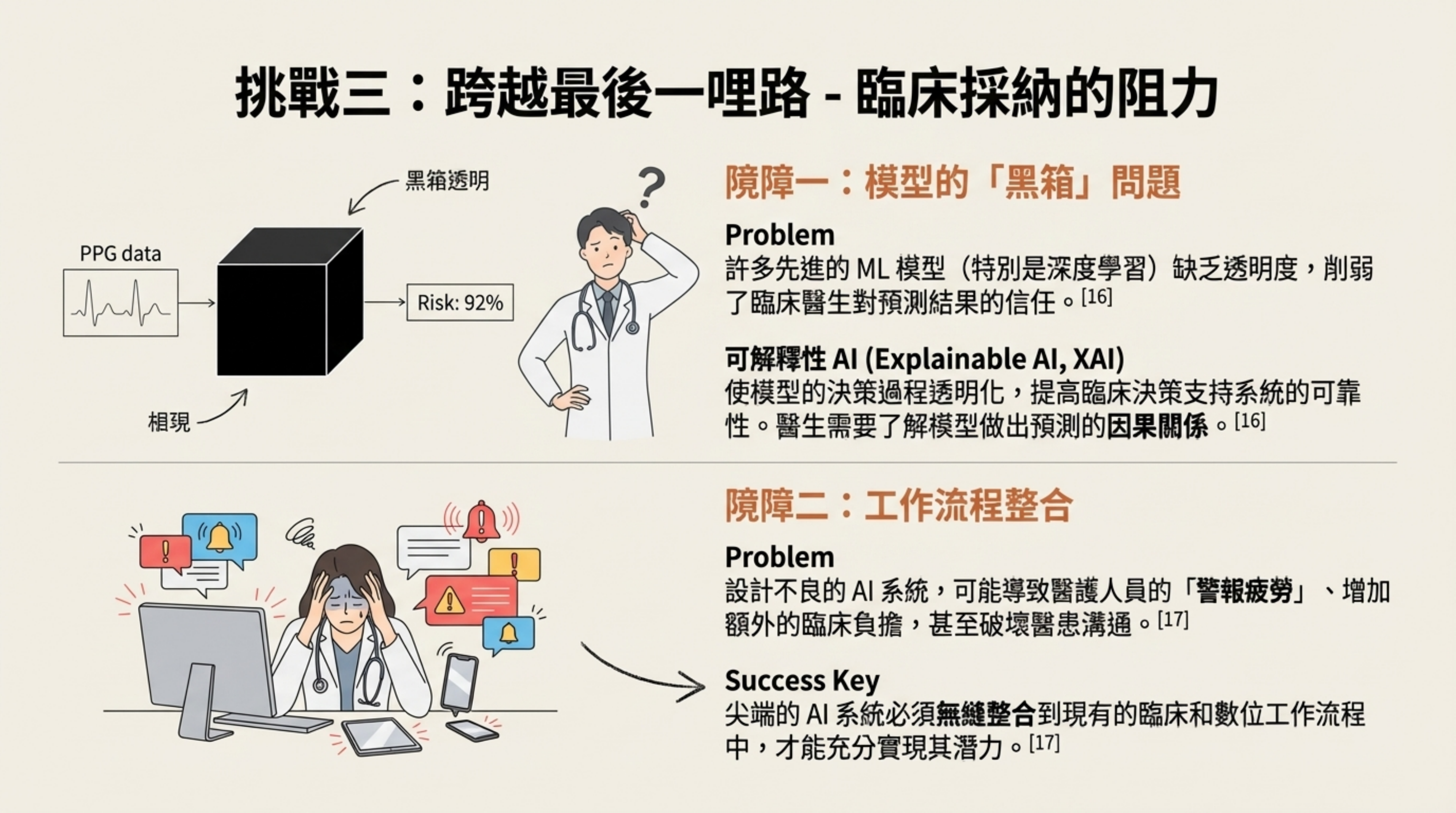 - 視覺核心:黑箱模型示意圖與醫生過勞(警報疲勞)圖示。