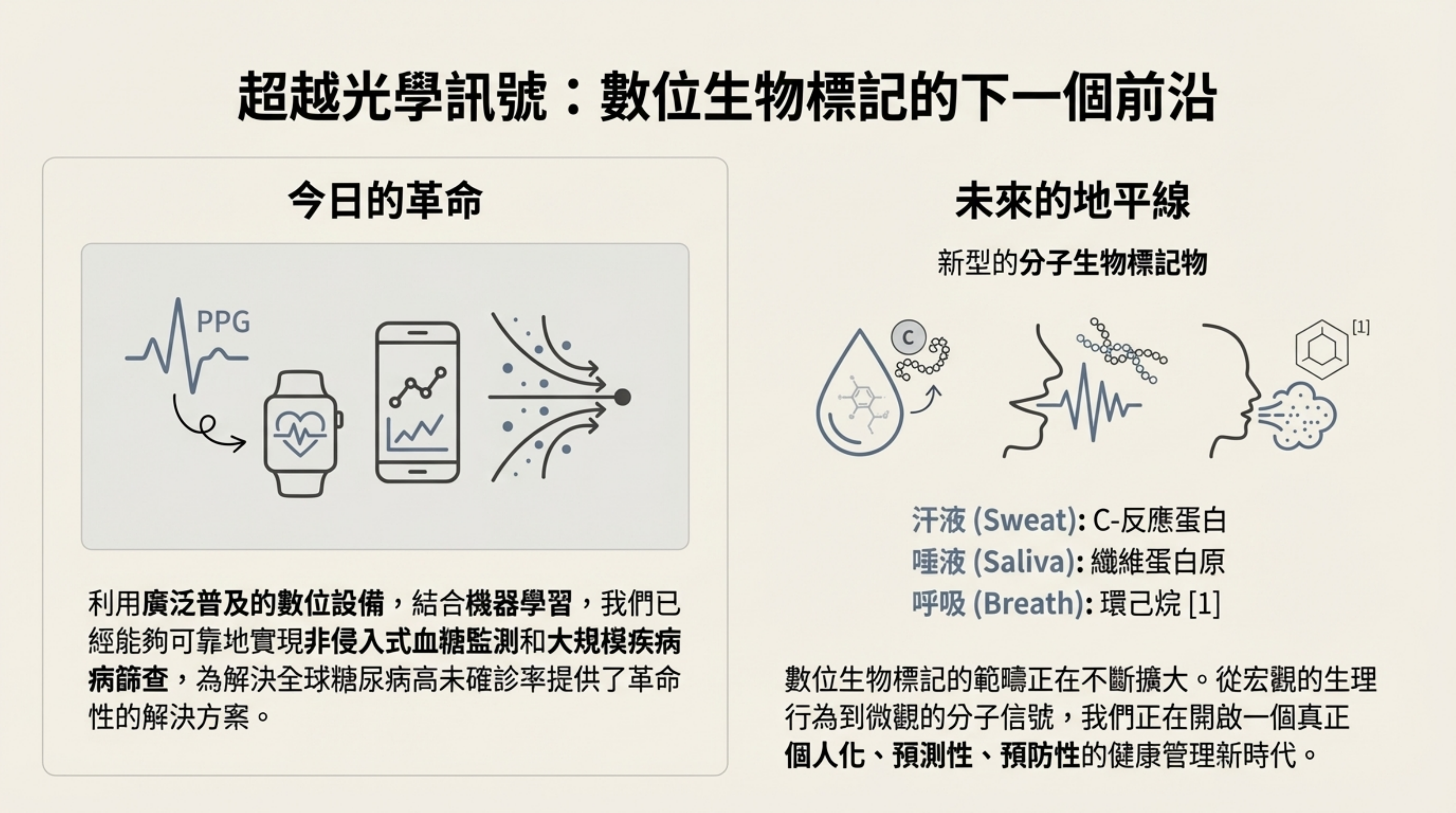 - 視覺核心:從 PPG(今日)演進到汗液、唾液、呼吸(未來)的圖示。